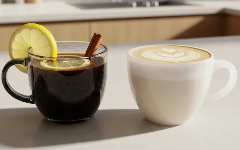 Lemon version is a mixture of two acidic ingredients. Coffee is already at a pH of 5. Adding lemon juice brings you to the range of pH 3-4 which is mean to the tooth enamel in the long run.